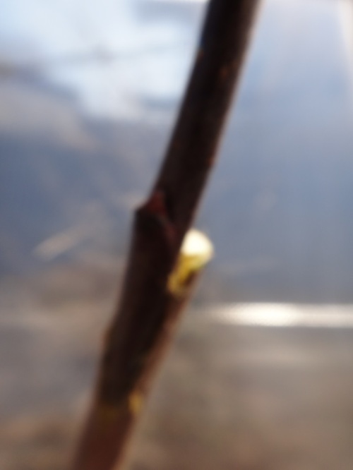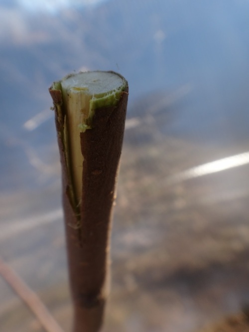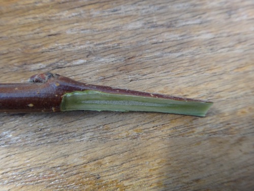 Обрезала секатором сеянец. Сделала разрез коры ножом и отодвинула кору с кадмием в стороны.