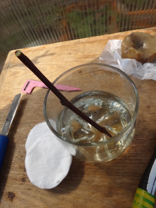 На черенке оставила 3 почки. Черенок опустила в стакан с водой. В воду добавила мед на кончике ложки.