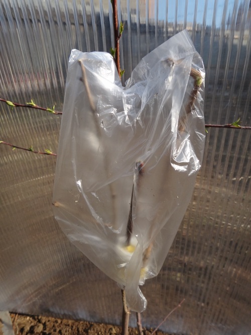 На привитый черенок одеваю пакет, но прежде прикрепила две любые веточки.